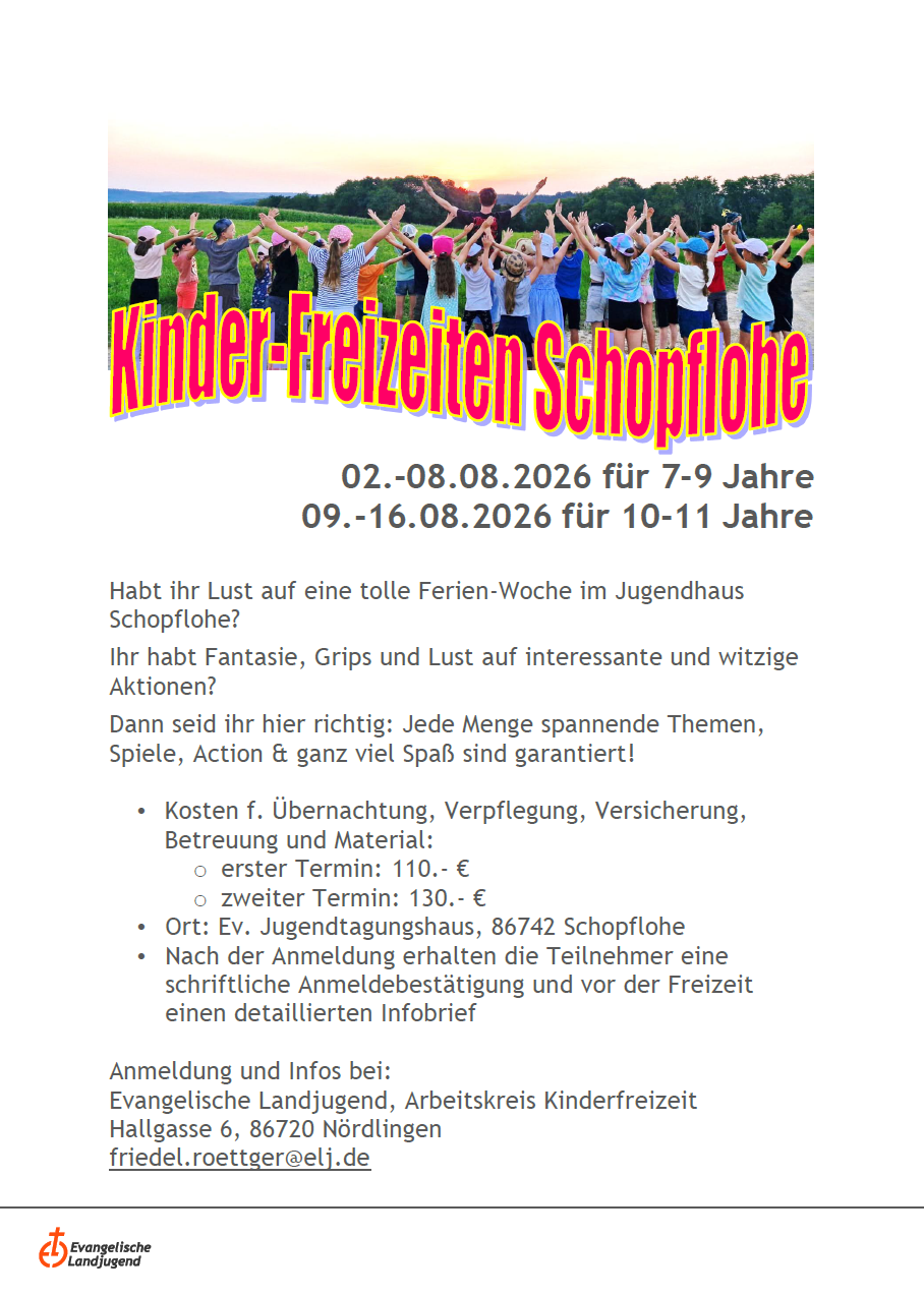 Ihr seid 7 - 9 oder 10 - 11 Jahre alt? Ihr habt Lust auf eine tolle Ferien-Woche im Jugendhaus Schopflohe? Ihr habt Fantasie, Grips und Lust auf interessante und witzige Aktionen? Dann seit ihr hier richtig: Jede Menge spannende Themen, Spiele, Action & ganz viel Spaß sind garantiert! Die evangelische Landjugend freut sich auf euch!
